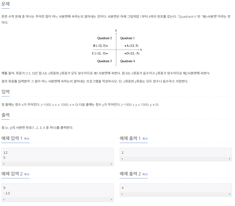 점 (x, y)의 사분면 번호(1, 2, 3, 4 중 하나)를 출력한다.