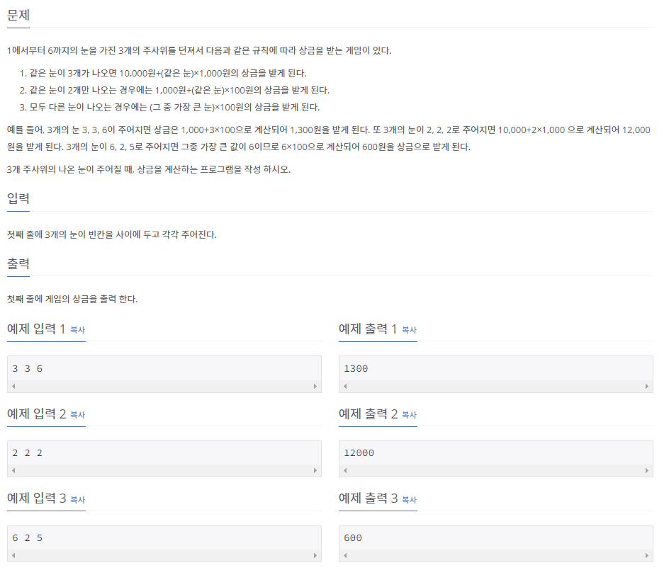 1에서부터 6까지의 눈을 가진 3개의 주사위를 던져서 다음과 같은 규칙에 따라 상금을 받는 게임이 있다. 같은 눈이 3개가 나오면 10,000원+(같은 눈)×1,000원의 상금을 받게 된다. 같은 눈이 2개