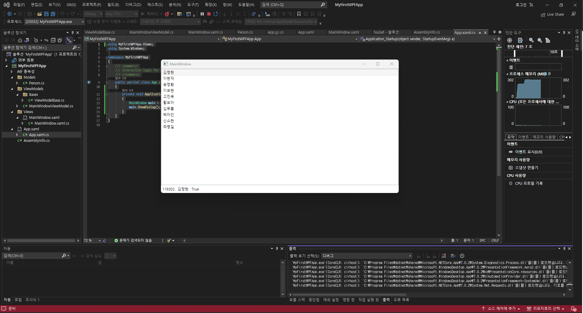 미리 People이라는 리스트 속성을 가진 변수에 Person 객체를 생성하여 MainWindowViewModel 객체가 생성될 때 넣도록 하였습니다.