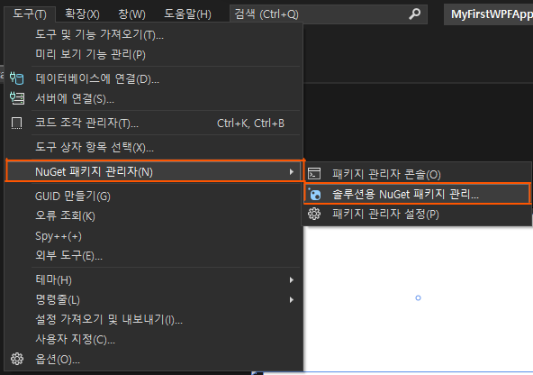 먼저, Visual Studio에서 "도구" -> "Nuget 패키지 관리자" -> "솔루션용 Nuget 패키지 관리" 로 들어갑니다.