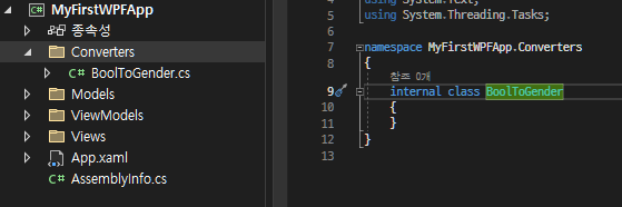 먼저 관리에 용이할 수 있도록 Converters라는 폴더를 최상위에 만들어 주고 BoolToGender.cs 라는 파일을 안에 생성합니다.