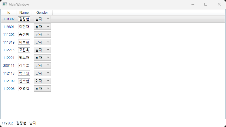 보시는 바와 같이 true값을 "남자", false값을 "여자"로 변환되었습니다. 콤보박스와 선택된 직원의 정보를 보는 아래 StackPanel에서도 똑같이 적용되는 것을 보실 수 있습니다.