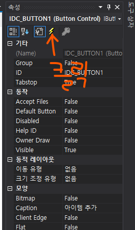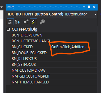 2. 버튼 속성창에서 'OnBtnClick_AddItem' 함수를 추가하고 버튼을 연결 시켜줍니다.